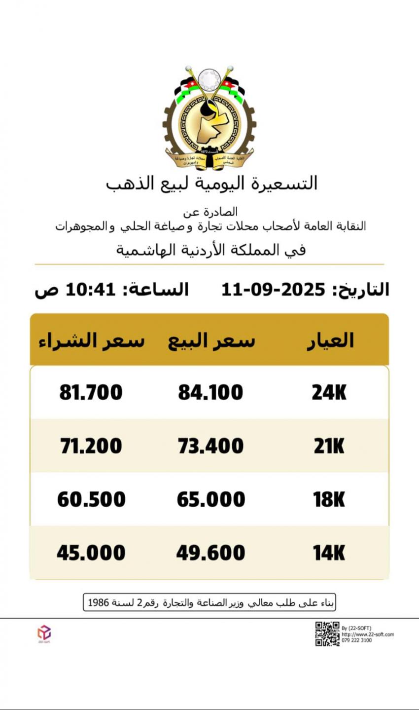 وحسب النشرة اليومية التي أصدرتها النقابة العامة لأصحاب محلات تجارة وصياغة الحلي والمجوهرات، بلغ سعر الغرام الواحد من الذهب عيارات 24 و 18 و 14 لغايات البيع من محلات الصاغة عند 84.1 دينار و 65 دينارا و 49.6 دينار على التوالي.