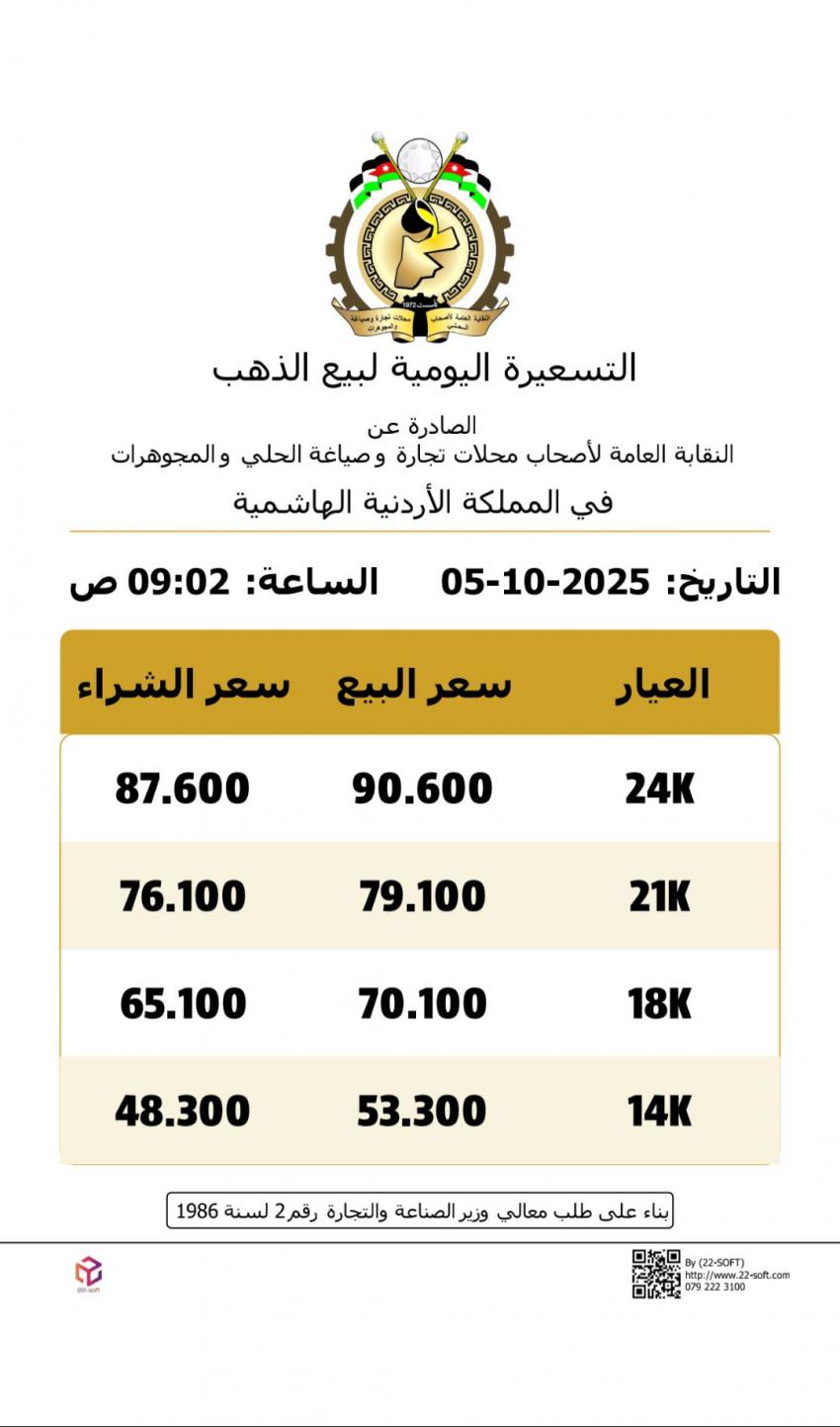 فيما بلغ سعر الغرام الواحد من الذهب عيارات 24 و 18 و14 لغايات البيع من محلات الصاغة عند 90.6 دينارا و70.10 و53.30 دينارا على التوالي.