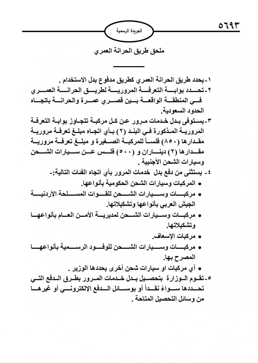 واشتمل النظام المنشور على ملحق خاص بطريق الحرانة - العمري، حددت فيه الحكومة تسعيرة المرور في اول طريق مدفوع بالأردن، والذي سيبدأ العمل به الشهر المقبل.