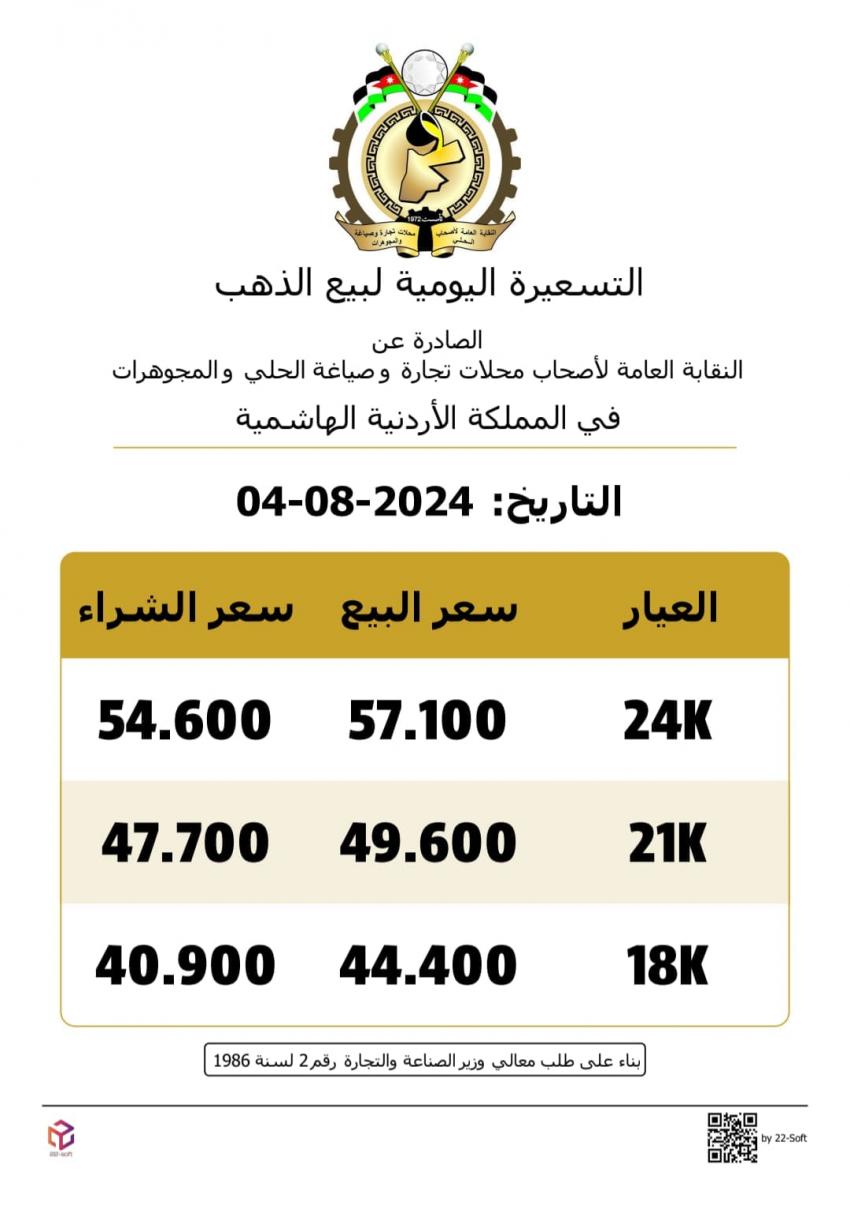 فيما بلغ سعر بيع الغرام الواحد من الذهب عياري 24 و18 لغايات الشراء من محلات الصاغة، عند 57.10 دينارا و44.40 دينارا على التوالي.