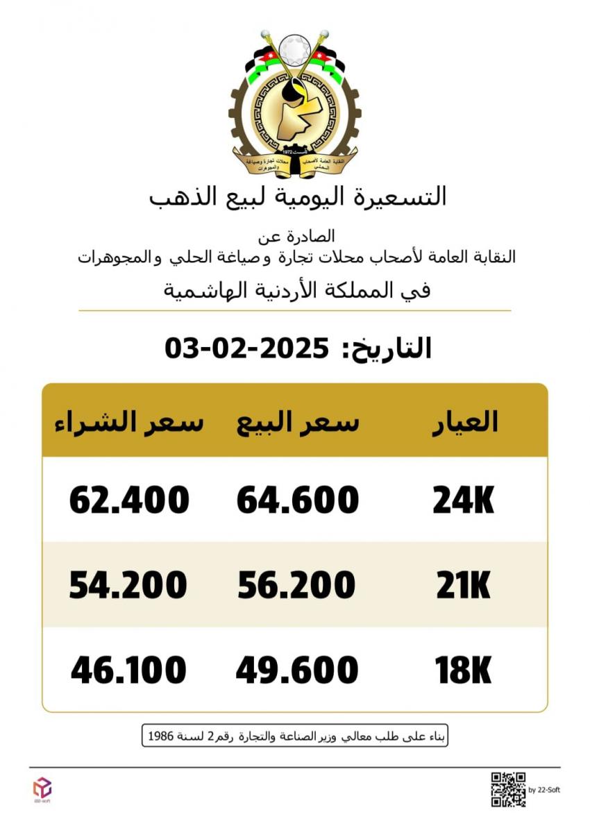 وبلغ سعر الغرام الواحد من عيار 21 الأكثر طلبا بين الأردنيين 56.20 دينارا لجهة البيع للمواطنين مقابل 54.20 دينارا لجهة الشراء منهم.