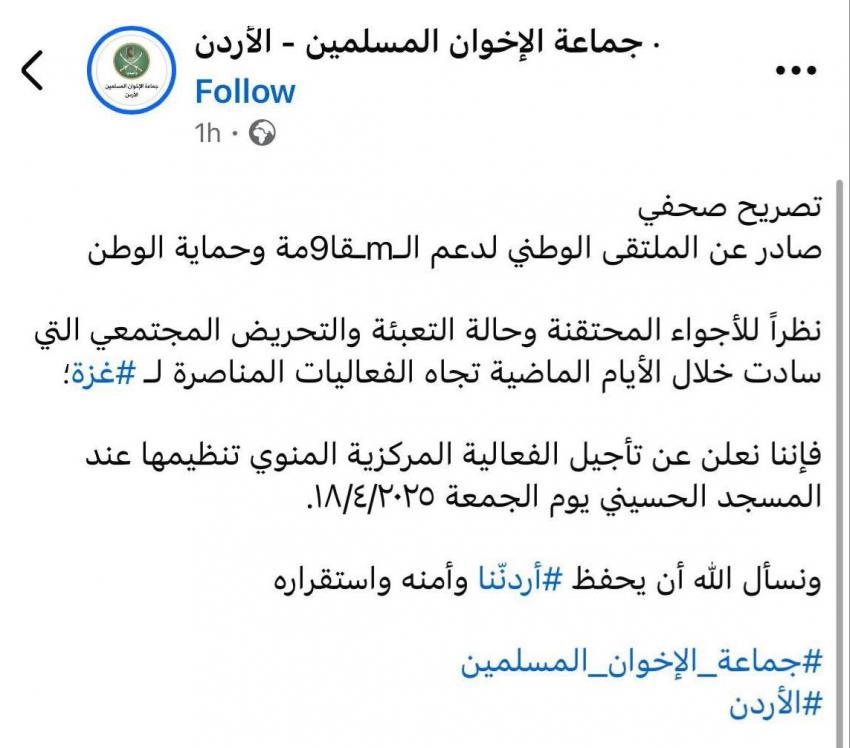 وجاء في بيان للجماعة: نظراً للأجواء المحتقنة وحالة التعبئة والتحريض المجتمعي التي سادت خلال الأيام الماضية تجاه الفعاليات المناصرة لـغزة، فإننا نعلن عن تأجيل الفعالية المركزية المنوي تنظيمها عند الحسيني الجمعة 18/4 ، ونسأل الله أن يحفظ أردننا وأمنه واستقراره'.