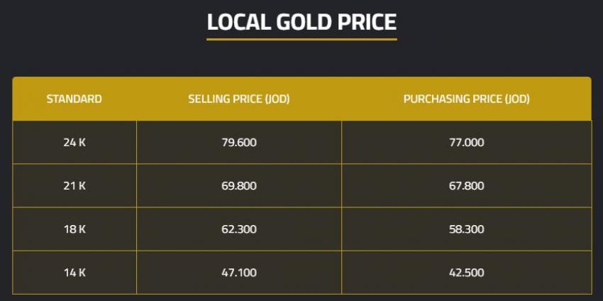 كما بلغت أسعار بيع الغرامات من الذهب عيارات 24 و18 و14 في المحال، 79.6 دينارًا و62.3 دينارًا و47.1 دينارًا على التوالي.