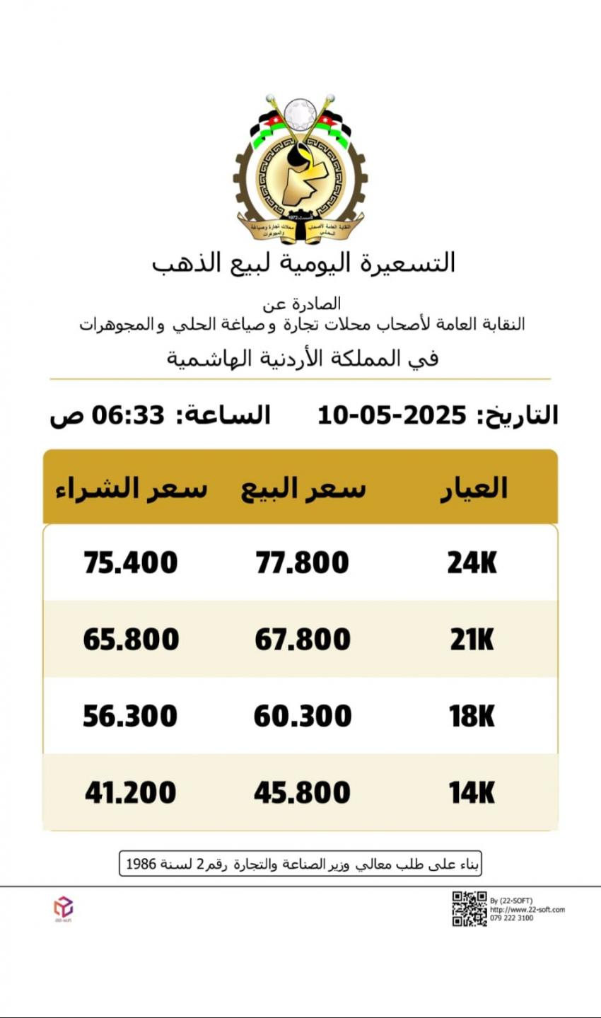 كما بلغ سعر بيع الغرام الواحد من الذهب عيارات 24 و18 و14، لغايات الشراء من محالّ الصاغة، 77.8 و60.3 و45.8 دينارًا على التوالي.