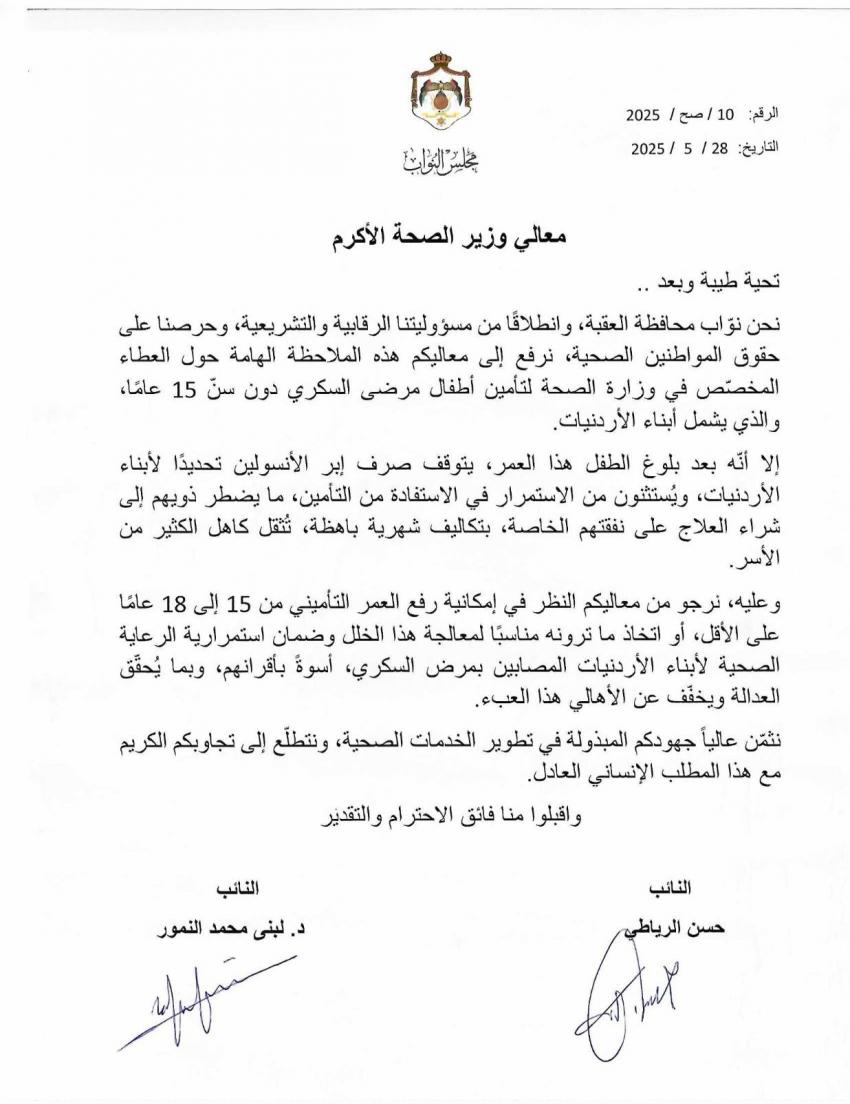 رفع نائبا محافظة العقبة، حسن الرياطي والدكتورة لبنى محمد النمور، مذكرة إلى وزير الصحة، طالبا فيها بتمديد العمر التأميني لأبناء الأردنيات المصابين بمرض السكري من 15 إلى 18 عاما على الأقل.