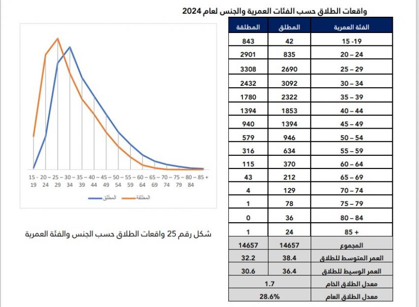 ووفق التقرير ، فإن الفئتين العمريتين (25 – 29) و(30 – 34)، الأعلى طلاقا.