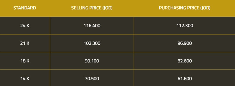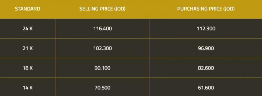 وبلغت أسعار عيارات 24 و18 و14 لغايات البيع من محلات الصاغة عند 116.4 دنانير و90.10 و70.5 دينارا على التوالي.